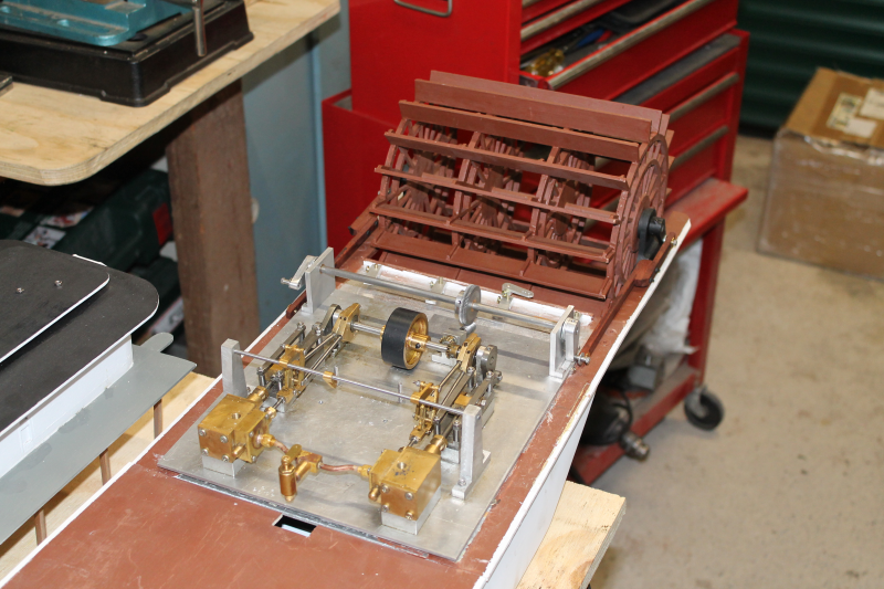 Well, work goes on apace and the engine mounting plate / paddle support has been cut to accommodate the paddle wheel. I've also made up a couple of bearing blocks from aluminium to take the shaft. I haven't made the eccentrics yet, so I've used a load of washers to fill the space between the paddle wheel and the bearing block. There's still quite a bit of finishing to do, but it's nice to know that it all fits together and works.