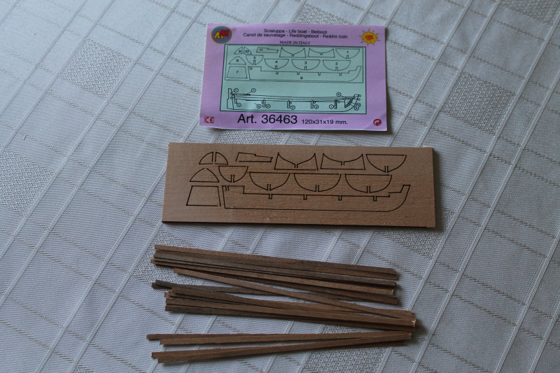 I need a pair of rowboats / lifeboats about 120 mm long to go on the model. After not too much deliberation, I decided to buy them. I had a look round on the 'net and found several possibilities. Rather than moulded plastic I decided on natural wood and ordered a couple of DIY ones. Now I've built quite a few boats in my time, but I've never planked a hull. This should be interesting.