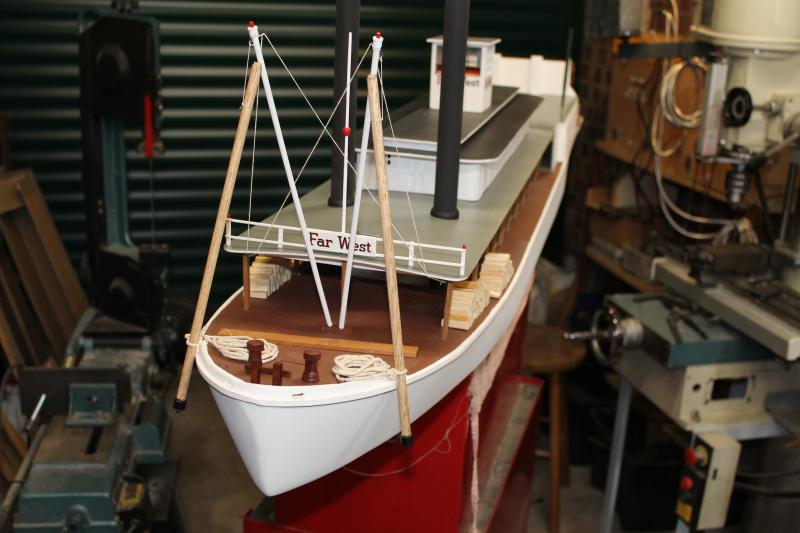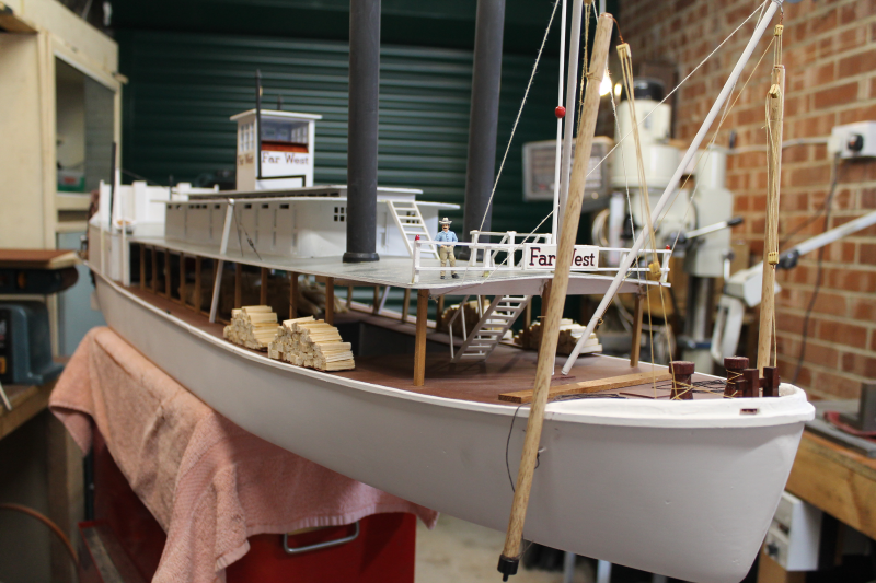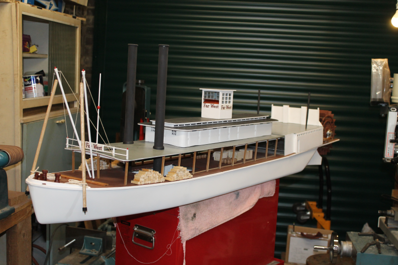 A few weeks ago, I had the idea to build a 2 inch scale traction engine along with a couple of friends from my model engineering club. All was going very well until I priced up the copper for the boiler. I got to 300 quid and stopped! A new project was needed. After some serious thought, the paddlesteamer was resurrected. I decided a while ago that I no longer had any interest in building a "wedding cake", so I looked around and found descriptions and even plans for "Far West". I was hooked. I scrapped the original decks - they were no good anyway, the dust of forty years was ingrained! But I kept the hull, all 60 or so inches of it. It won't be an exact scale model - rather a "stand off scale" as the beam is a bit more than it should be.