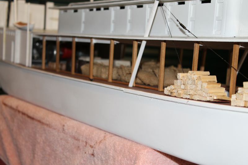 Another couple of weeks have passed by, but I haven't been idle. I decided that Far West, being primarily a cargo carrier, needed some more cargo so I set to with the sewing machine and some hessian from our local market and made two dozen sacks. Stuffed with lentils, these are quite passable. I also made six large barrels and four hessian bales. Now the deck looks reasonable.