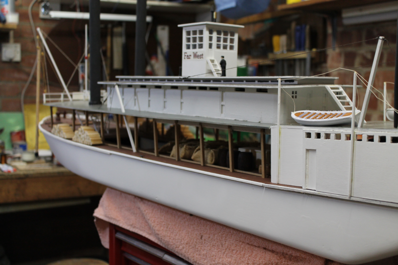 Far West was 190ft long and 33ft in beam. Unloaded, she had a draft of 20 inches, whilst loaded to her maximum of 398 tons her draft was 4ft 6 inches. She was built in 1870 and after an eventful career, was lost in 1883 after she hit a snag in the river and sank.