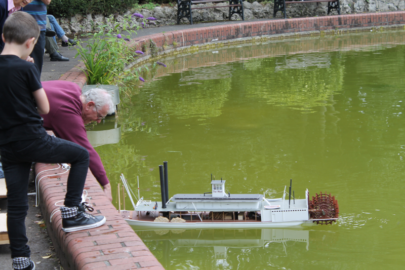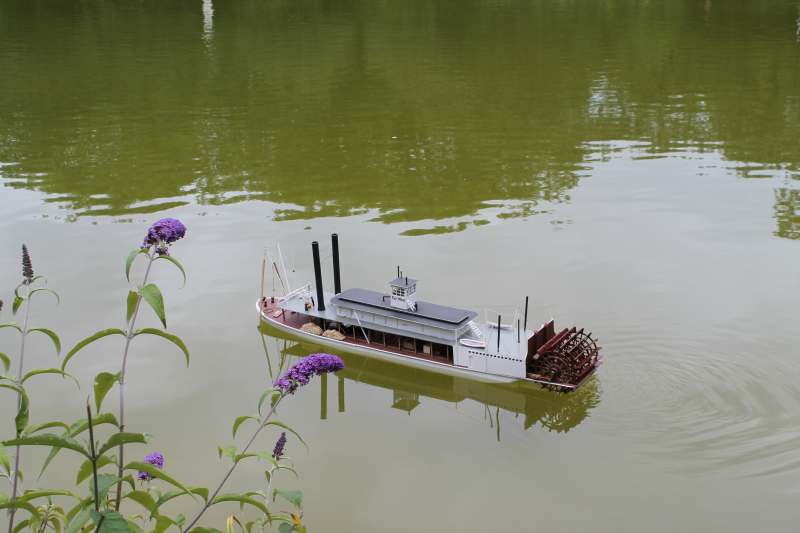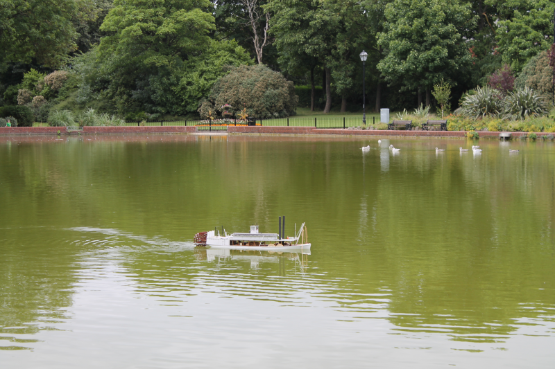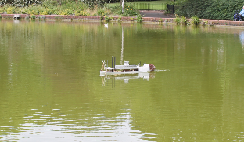 About a week after its first dunk in the pond, I was ready to try again, so off to the park. This time I'd got the ballast about right, about 0.5 inches freeboard and no list. I couldn't resist having a quick check of the paddlewheel and the rudders. Just a simple circle to prove all was well - and it was. Back to the workshop for a few improvements like plugs and sockets for the lighting circuits. Now I can say it's fully ready to sail.