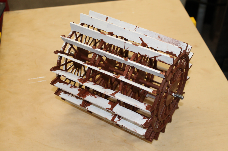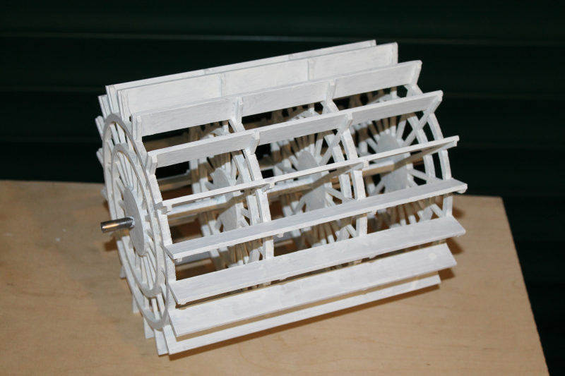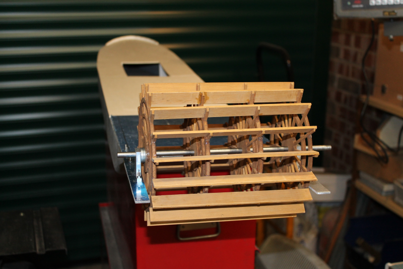 In the meanwhile, waiting for glue to dry, I gave the paddle wheel its first coat of paint. What a rotten job! It has to be done by hand as you'd never get an even coating with a spray. It is one of the most tedious jobs I have ever done. Talk about watching paint dry! I reckon this has taken some 3 1/2 hours - and that's only the first undercoat. At least 2 more coats to go.