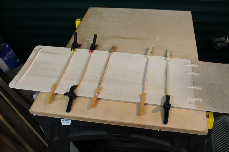 A short while later, I heard "quiet gunshots" as the ribs came adrift from the ply. After several naughty words I surmised that the new glue must have weakened the bond of the probably not wholly cured first glueing. I had to resort to pinching several clothes pegs from my wife's peg bag ( I didn't have enough clamps ) and now each rib is held to the roof with either a peg or a clamp. We'll see what tomorrow brings!
