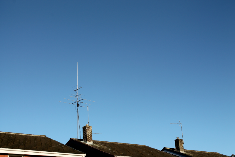 In order to reduce the load on the aluminium mast, I've removed the dual band collinear and replaced it with a tri-band (6m, 2m & 70cms) one and mounted it on the chimney stack. I've also got my weather station up there too.