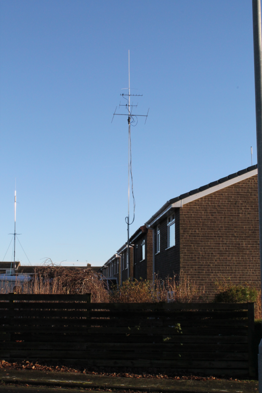 I ordered an aluminium telescopic mast 6 metres high in the low position and 11.5 meters when raised and topped it off with a 3 element 6 metre beam, a 5 element 2 metre beam and a 10 element 70 cms beam and mounted the collinear on top.